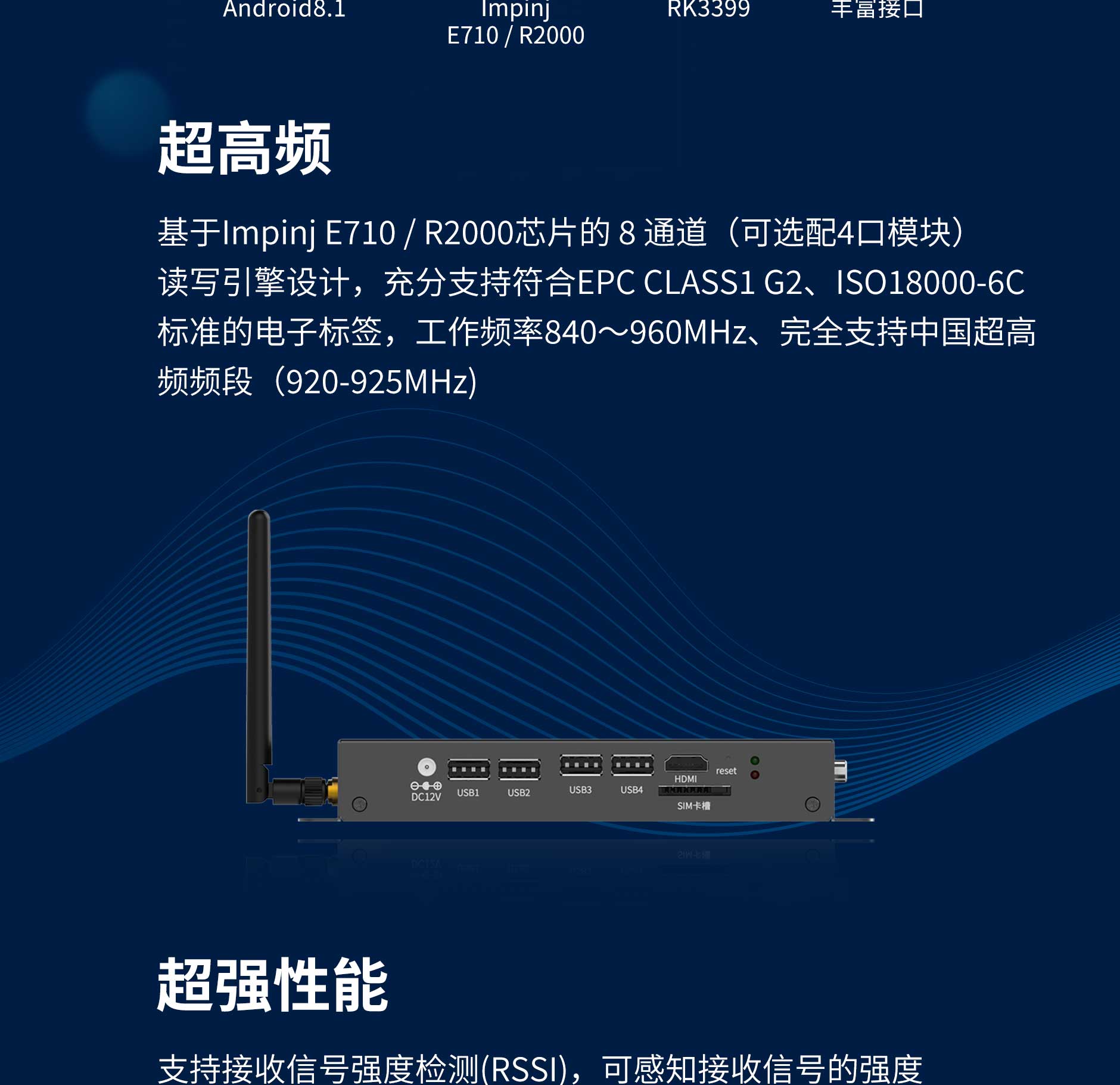 | RFID(超高頻) | 協(xié)議標(biāo)準(zhǔn):EPC G2/ISO 18000-6C; 工作頻率:中國(guó)(920-925MHz); 北美(902-928MHz); 歐頻(865-867MHz); 天線參數(shù):支持4個(gè)外接SMA天線接口(可選配8口模塊),支持天線檢測(cè)、支持接收信號(hào)強(qiáng)度檢測(cè)(RSSI); 功率:工作電壓 12V,射頻輸出5dBm到33dBm(1W),1dbm可調(diào); 讀卡距離:不小于10米; 群讀速率>400標(biāo)簽每秒(8口模塊不少于750) |