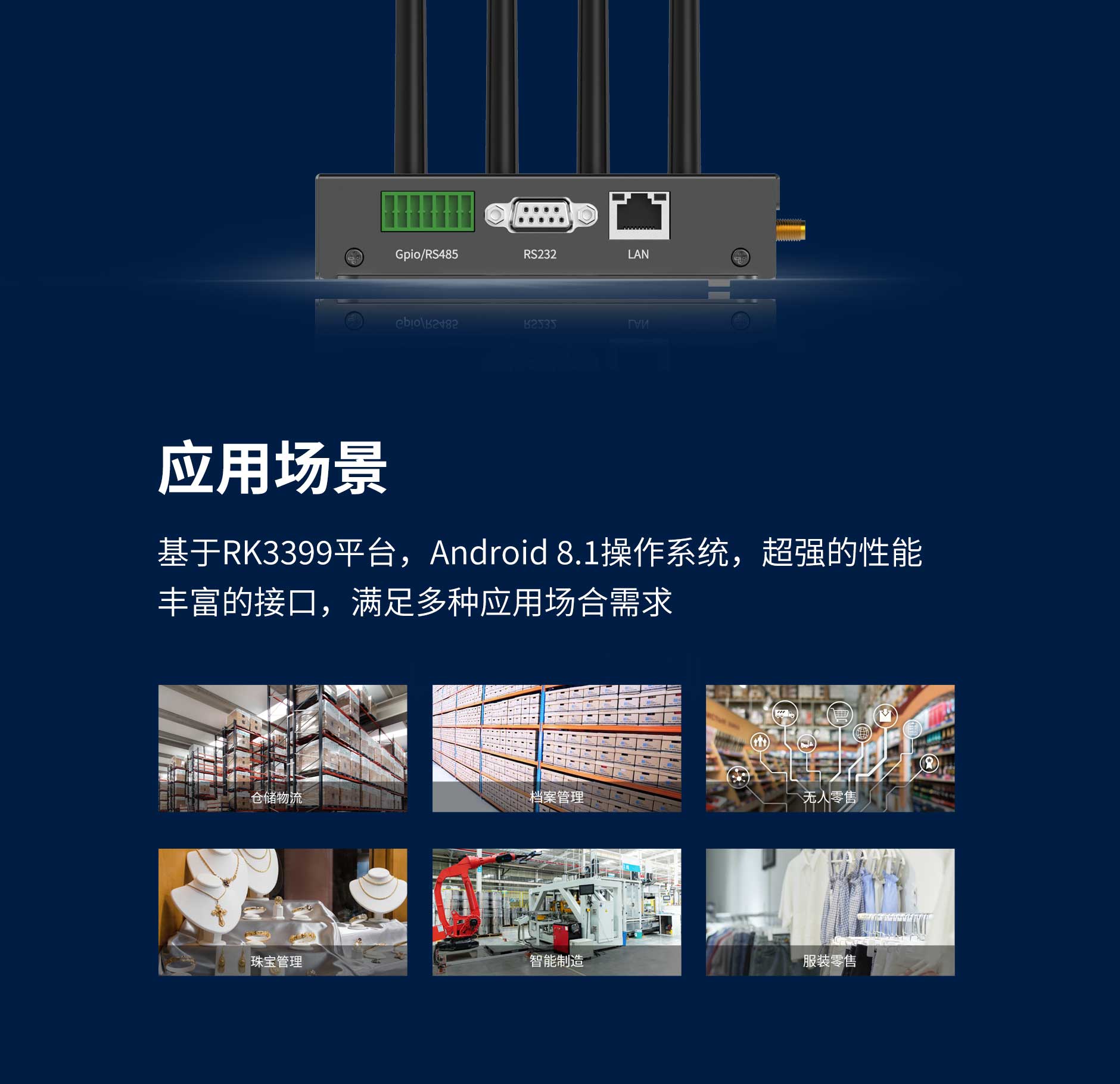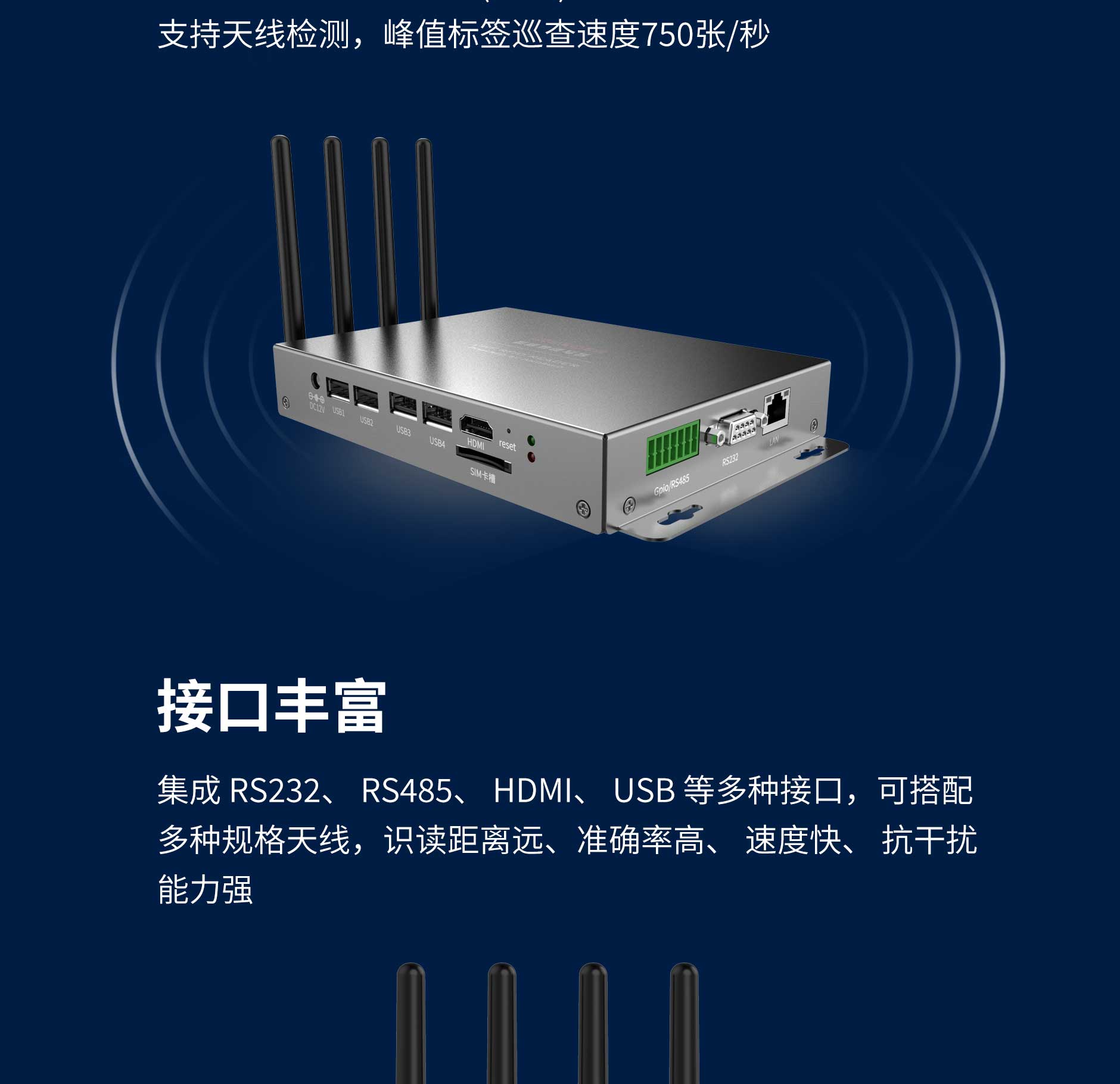 | 其他 | 8口SMA超高頻天線接口(可選配4口模塊) 以太網(wǎng)口(RJ45); RS232(DB9),RS485 HDMI 支持4路光耦隔離GPIO,隔離電壓VRMS>3kV、支持選配報(bào)警器,可發(fā)送指令控制報(bào)警器開(kāi)啟、關(guān)閉 |